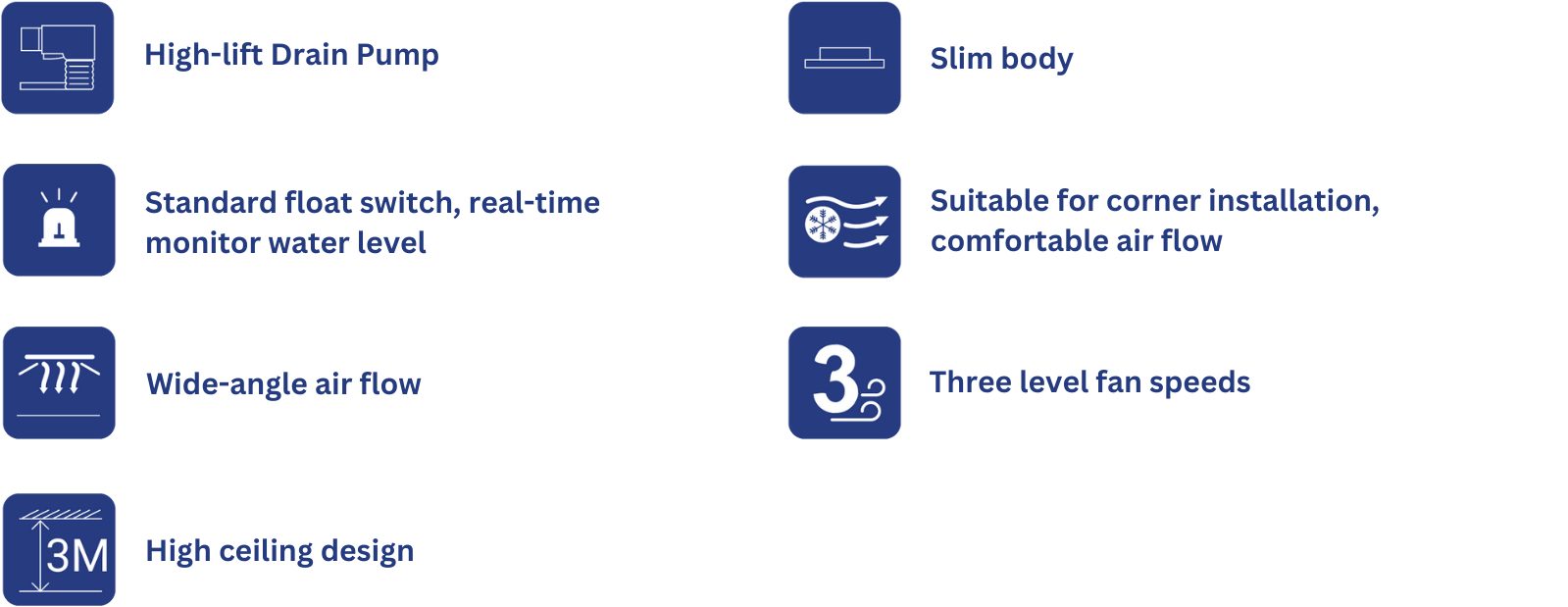 Reserves a super high fan speed for high ceiling installation, unit can provide powerful cooling and heating under a more than 3 meters floor height.
